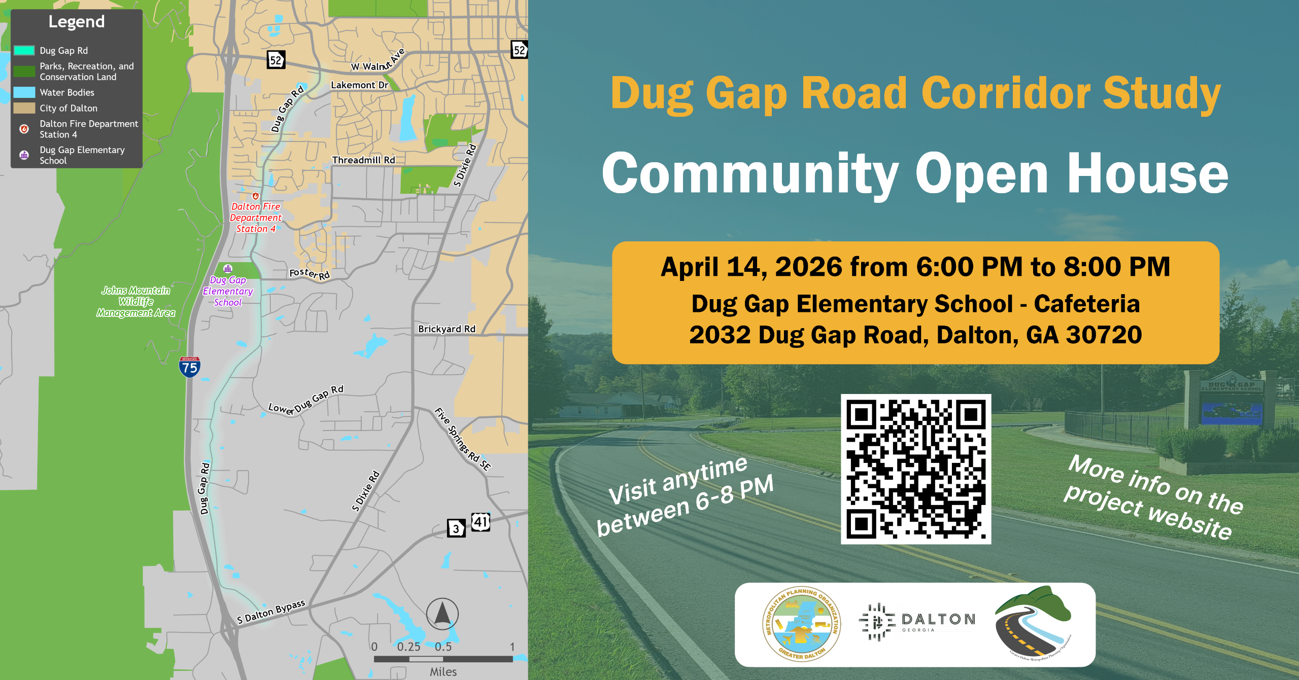 The Dug Gap Road Corridor Study team will be hosting a community open house on April 14, 2026, at Dug Gap Elementary School cafeteria. Please join us and let us know what you think about the proposed recommendations for improvements along the corridor!